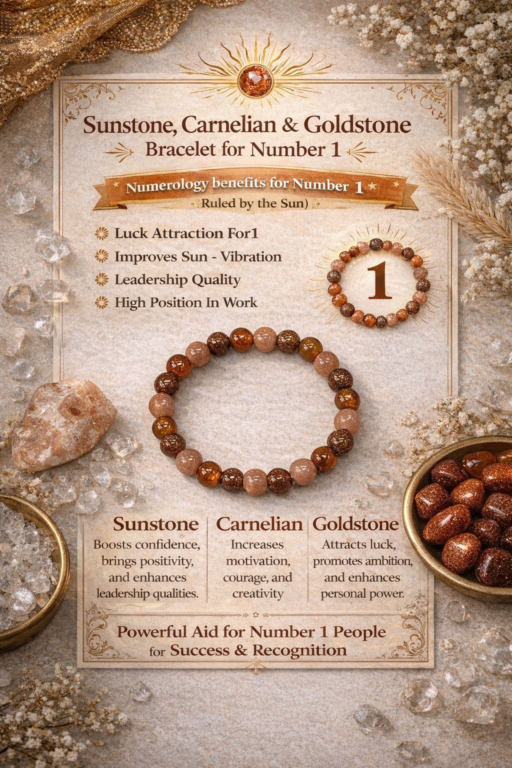 Focuses on leadership, new beginnings, confidence. Often uses Sunstone, Pyrite, or Clear Quartz for energy and focus.